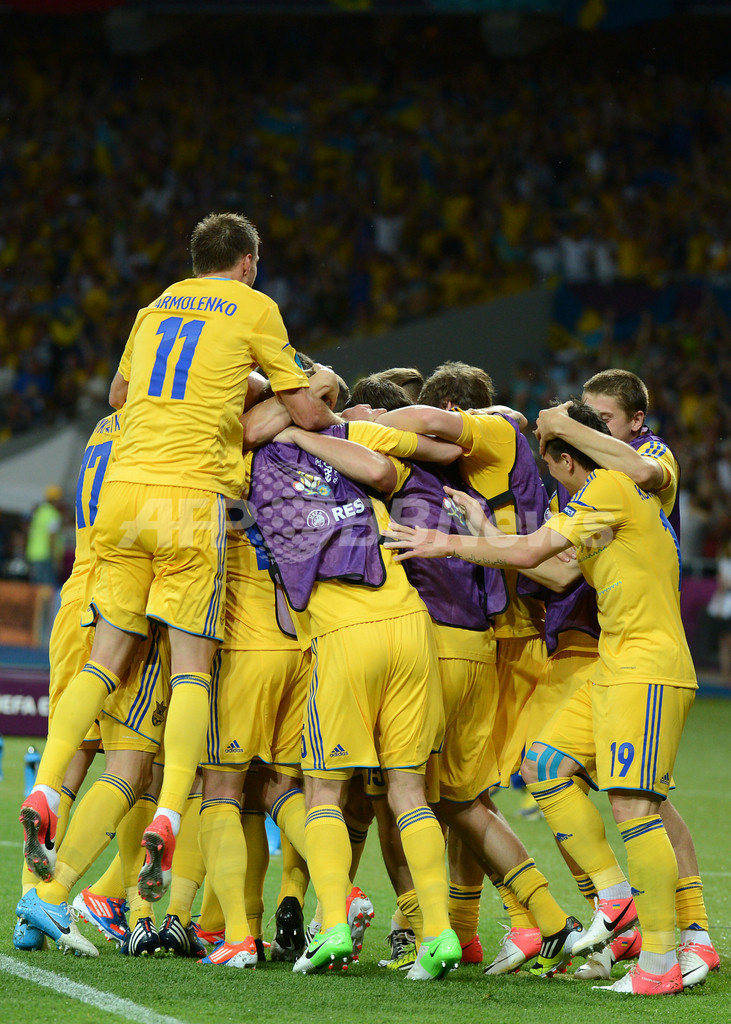 同日行われたフランス対イングランド戦が1-1の同点に終わったため、勝利したウクライナがグループ首位に立っている。(c)AFP