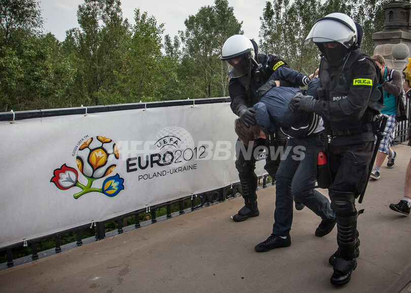 【6月13日 AFP】ポーランド・ワルシャワ(Warsaw)で12日に行われたサッカー欧州選手権2012(UEFA Euro 2012)のポーランド対ロシア戦で、試合開始前に両国のサポーターらが衝突し、警官隊が放水銃や催涙ガスを使って鎮圧する騒ぎが起きた。(c)AFP
