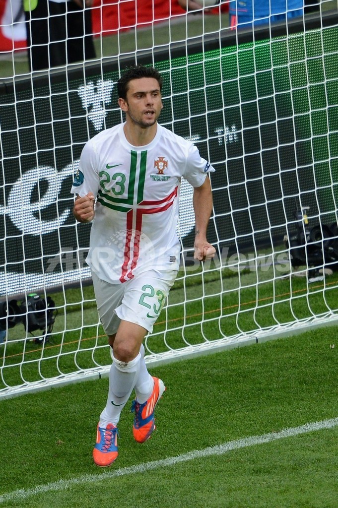 前半36分にチーム2得点目を挙げるポルトガルのエルデル・ポスティガ(Helder Postiga、2012年6月13日撮影)。(c)AFP/ANNE-CHRISTINE POUJOULAT