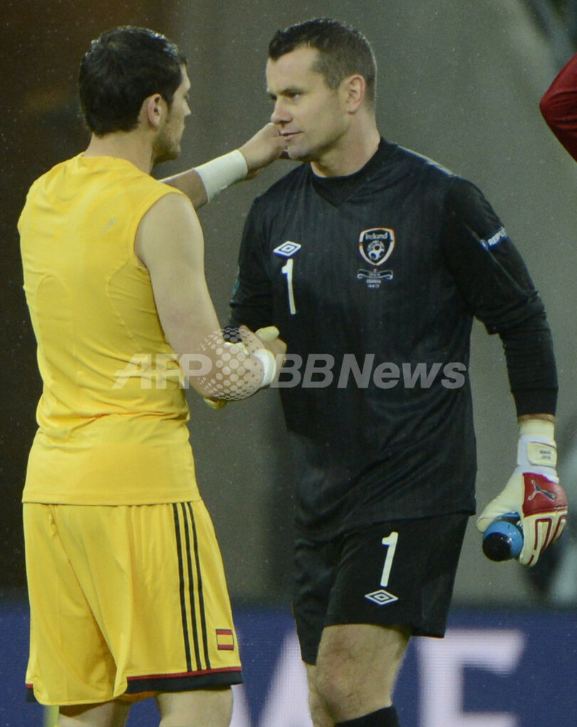 試合後、スペインのイケル・カシージャス(Iker Casillas)と握手を交わすアイルランドのシェイ・ギブン(Shay Given、2012年6月14日撮影)。(c)AFP/PIERRE-PHILIPPE MARCOU