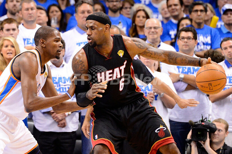 オクラホマシティ・サンダーのケビン・デュラント(Kevin Durant)とマッチアップするマイアミ・ヒートのレブロン・ジェームズ(LeBron James、2012年6月14日撮影)。(c)AFP/Getty Images/Ronald Martinez