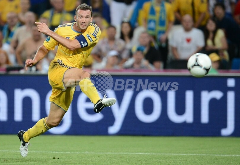 ボールを蹴るウクライナのアンドリー・シェフチェンコ(Andriy Shevchenko、2012年6月15日撮影)。(c)AFP/FRANCK FIFE