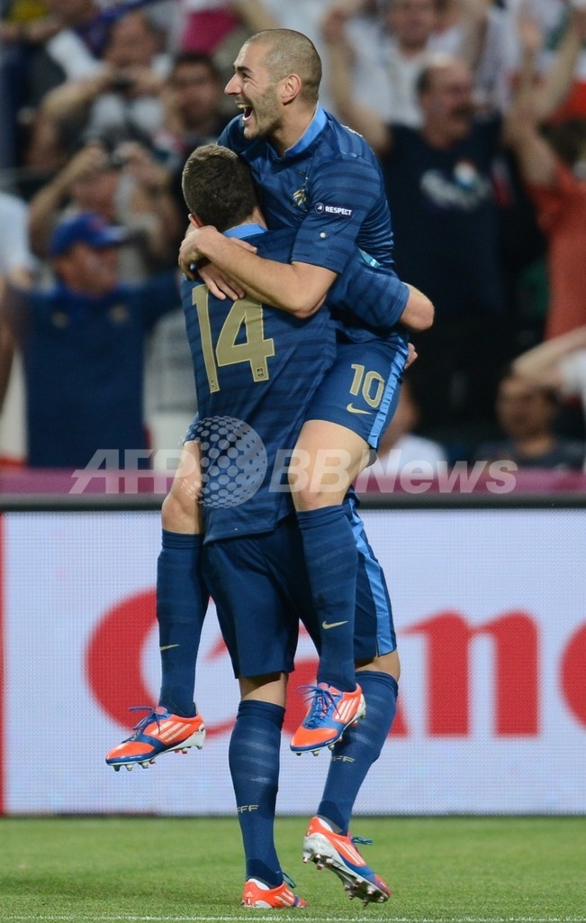 後半8分に先制点を挙げたジェレミ・メネス(Jeremy Menez)を祝福するフランスのカリム・ベンゼマ(Karim Benzema、2012年6月15日撮影)。(c)AFP/FRANCK FIFE