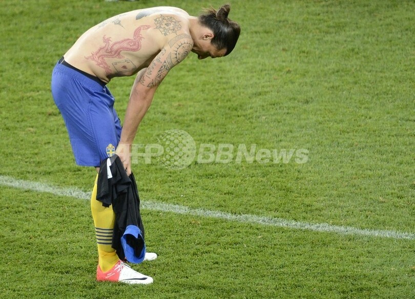 試合に敗れ、落胆するスウェーデンのズラタン・イブラヒモビッチ(Zlatan Ibrahimovic、2012年6月15日撮影)。(c)AFP/JONATHAN NACKSTRAND