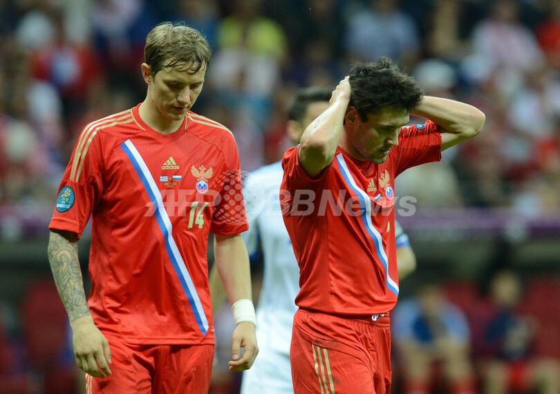敗退が決まったロシアはとチェコに4-1で快勝、ポーランドと1-1で引き分けて無敗だったが、ギリシャに番狂わせを演じられた。(c)AFP/Jonathan Fowler