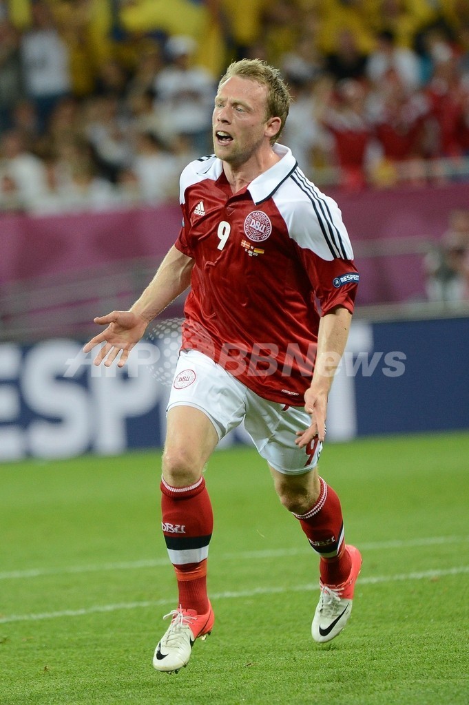 前半24分に同点ゴールを挙げ、歓喜するデンマークのミカエル・クロン・デリ(Michael Krohn-Dehli、2012年6月17日撮影)。(c)AFP/ANNE-CHRISTINE POUJOULAT