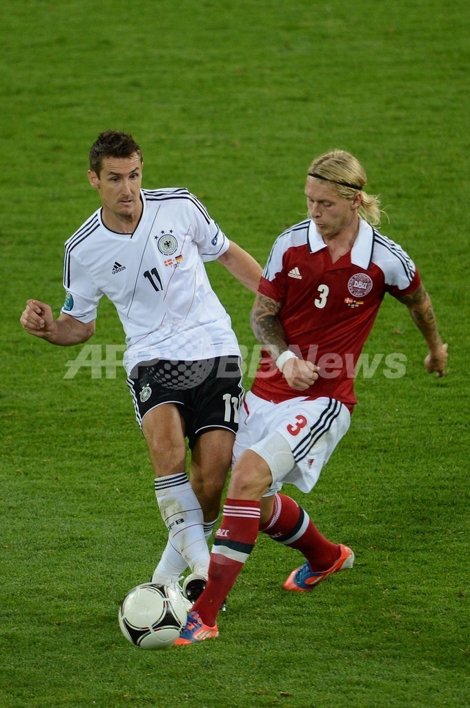デンマークのシモン・キアル(Simon Kjaer、右)とボールを競るドイツのミロスラフ・クローゼ(Miroslav Klose、2012年6月17日撮影)。(c)AFP/PATRIK STOLLARZ