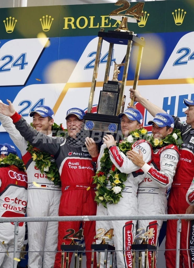 【6月18日 AFP】第80回ルマン24時間耐久レース(Le Mans 24-hour race 2012)は17日、ル・マン(Le Mans)のサルト・サーキット(Circuit de la Sarthe)で決勝のゴールを迎え、ブノワ・トレルイエ(Benoit Treluyer、フランス)/マルセル・ファスラー(Marcel Fassler、スイス)/アンドレ・ロッテラー(Andre Lotterer、ドイツ)組のアウディR18e-tronクアトロ(Audi R18 e-tron quattro)が378周を走行し、優勝を果たした。 1999年の第67回大会以降では、アウディ勢が13大会で11度の優勝を飾っている。また、トレルイエ/ファスラー/ロッテラー組は2連覇を飾っている。 初開催の1923年以来、ハイブリッド(HV)車が優勝したのは初めて。 2位には377周でアラン・マクニッシュ(Allan McNish、デンマーク)/リナルド・カペッロ(Rinaldo Capello、イタリア)/トム・クリステンセン(Tom Kristensen、ドイツ)組のアウディR18e-tronクアトロ、3位には375周でオリバー・ジャービス(Oliver Jarvis、英国)/マルコ・ボナノーミ(Marco Bonanomi、イタリア)/マイク・ロッケンフェラー(Mike Rockenfeller、ドイツ)組のアウディR18ウルトラ(Audi R18 Ultra)が入り、アウディ勢が表彰台を独占した。(c)AFP/Daniel Ortelli
