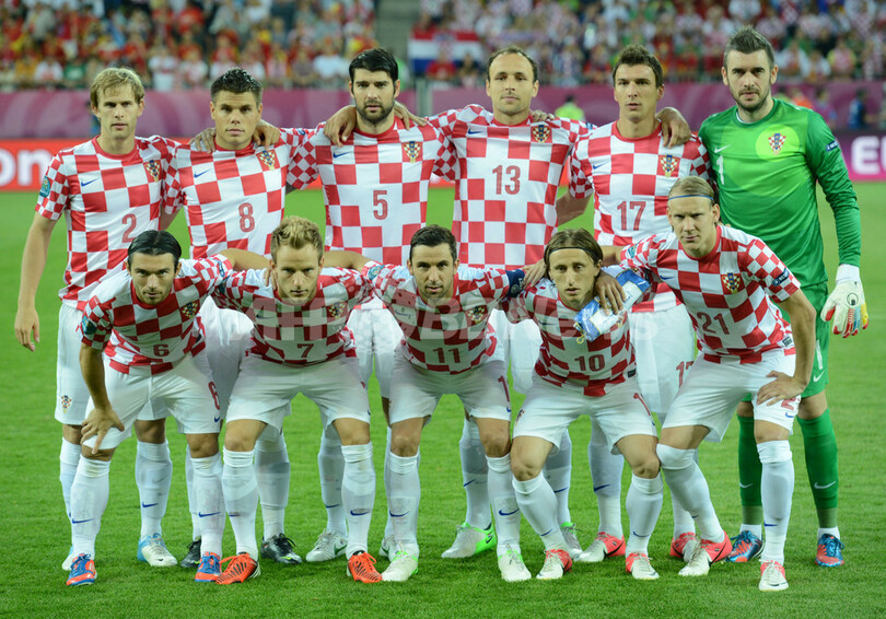 試合前の写真撮影に臨むクロアチアの選手(2012年6月18日撮影)。(c)AFP/DIMITAR DILKOFF