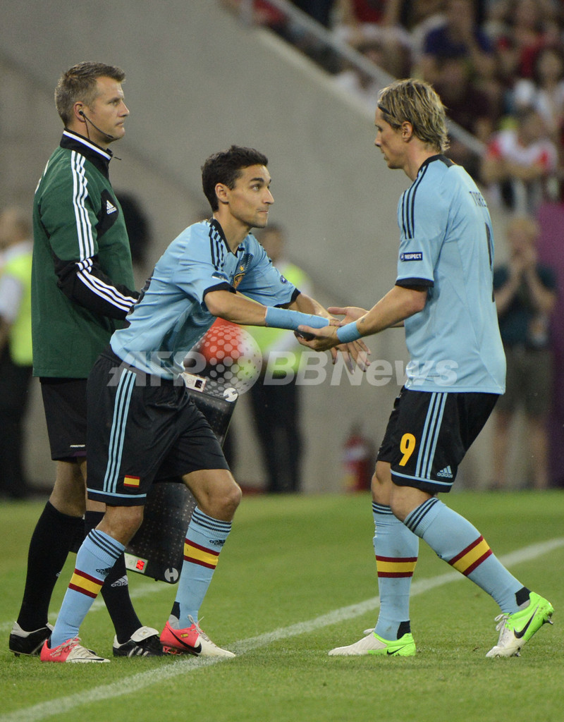 フェルナンド・トーレス(Fernando Torres、右)と交代でピッチに入るスペインのヘスス・ナバス(Jesus Navas、2012年6月18日撮影)。(c)AFP/PIERRE-PHILIPPE MARCOU