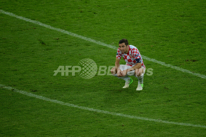 ピッチに座り込み落胆した様子を見せるクロアチアのダリオ・スルナ(Darijo Srna、2012年6月18日撮影)。(c)AFP/PATRIK STOLLARZ