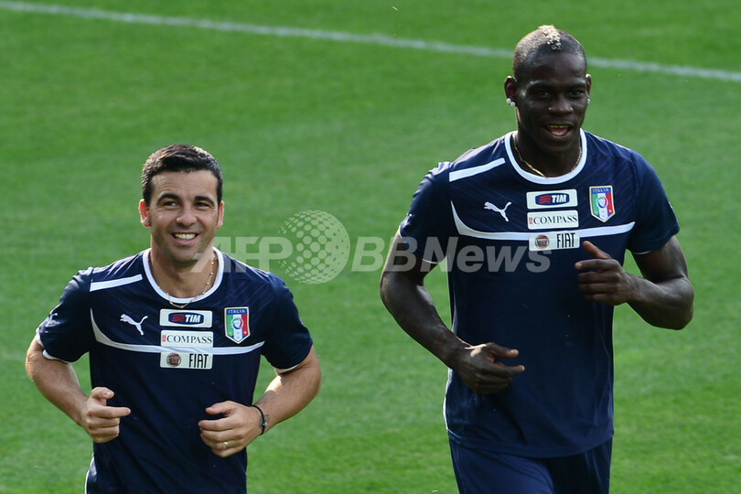 練習に臨むイタリアのアントニオ・ディ・ナターレ(Antonio Di Natale、左)とマリオ・バロテッリ(Mario Barwauh Balotelli、2012年6月20日撮影)。(c)AFP/GIUSEPPE CACACE