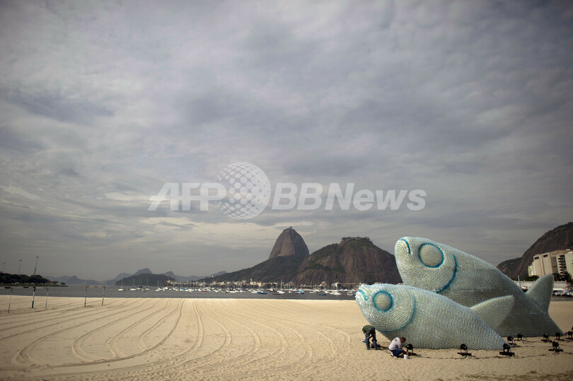 【6月21日 AFP】20日開幕した国連持続可能な開発会議(リオ+20、Rio+20)に合わせ、ブラジル・リオデジャネイロ(Rio de Janeiro)のボタフォゴ(Botafogo)ビーチに、ペットボトルをリサイクルして作った巨大な魚のオブジェが登場した。