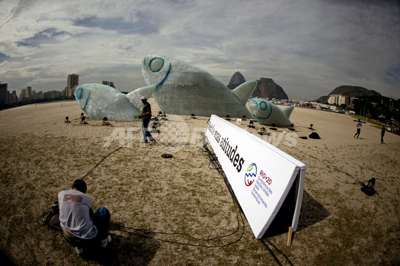 【6月21日 AFP】20日開幕した国連持続可能な開発会議(リオ+20、Rio+20)に合わせ、ブラジル・リオデジャネイロ(Rio de Janeiro)のボタフォゴ(Botafogo)ビーチに、ペットボトルをリサイクルして作った巨大な魚のオブジェが登場した。