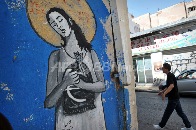 写真は、アテネの街角に描かれた経済危機をテーマにした落書き。ユーロ紙幣が入った袋を抱える聖女のイメージで、ギリシャ救済を描いている(2012年6月14日撮影)。(c)AFP/LOUISA GOULIAMAKI