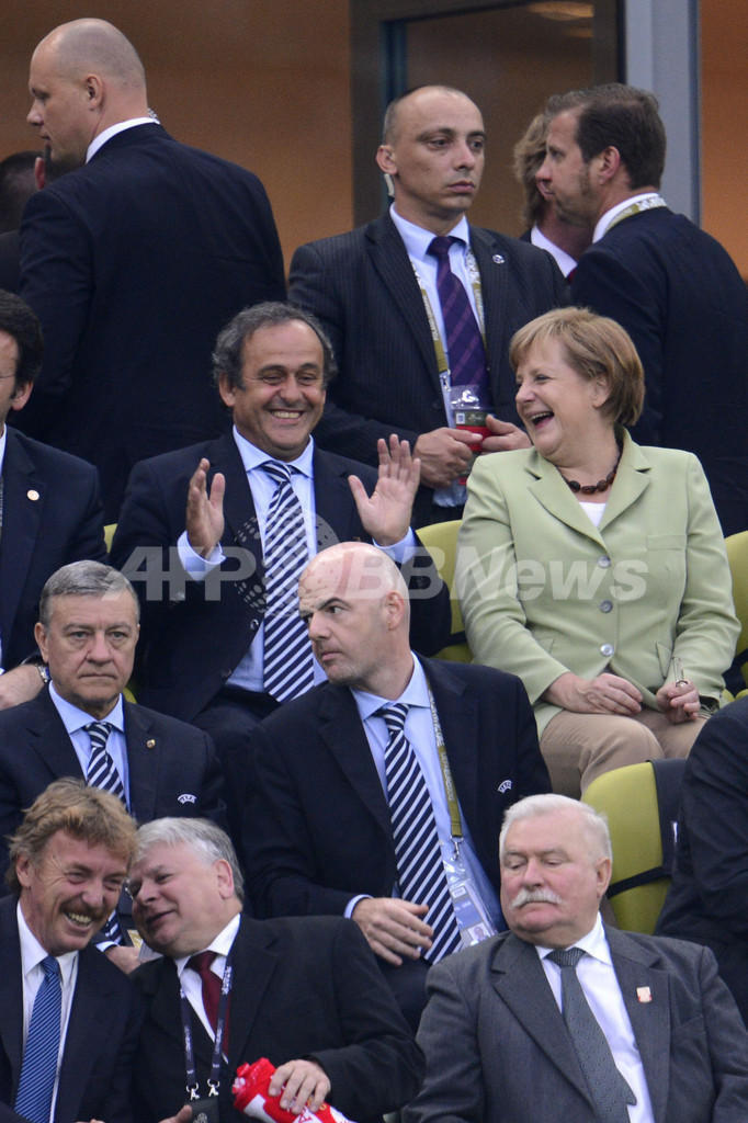 写真は、試合を観戦する欧州サッカー連盟(Union of European Football Associations、UEFA)のミシェル・プラティニ(Michel Platini)会長(中央左)とメルケル首相(中央右、2012年6月22日撮影)。(c)AFP/FABRICE COFFRINI