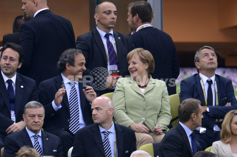 写真は、試合を観戦する欧州サッカー連盟(Union of European Football Associations、UEFA)のミシェル・プラティニ(Michel Platini)会長(中央左)とメルケル首相(中央右、2012年6月22日撮影)。(c)AFP/FABRICE COFFRINI