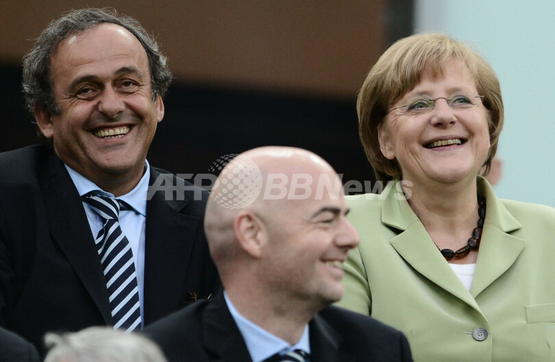 写真は、試合を観戦する欧州サッカー連盟(Union of European Football Associations、UEFA)のミシェル・プラティニ(Michel Platini)会長(左)とメルケル首相(右、2012年6月22日撮影)。(c)AFP/ARIS MESSINIS