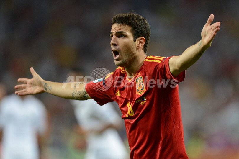 審判の判定に抗議するスペインのセスク・ファブレガス(Cesc Fabregas、2012年6月23日撮影)。(c)AFP/PATRICK HERTZOG