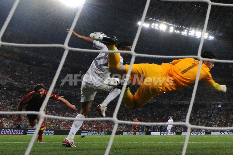 【6月24日 AFP】サッカー欧州選手権2012(UEFA Euro 2012)は23日、共催国ウクライナのドネスク(Donetsk)で準々決勝が行われ、前回王者のスペインは2-0でフランスを破り、準決勝に進出した。