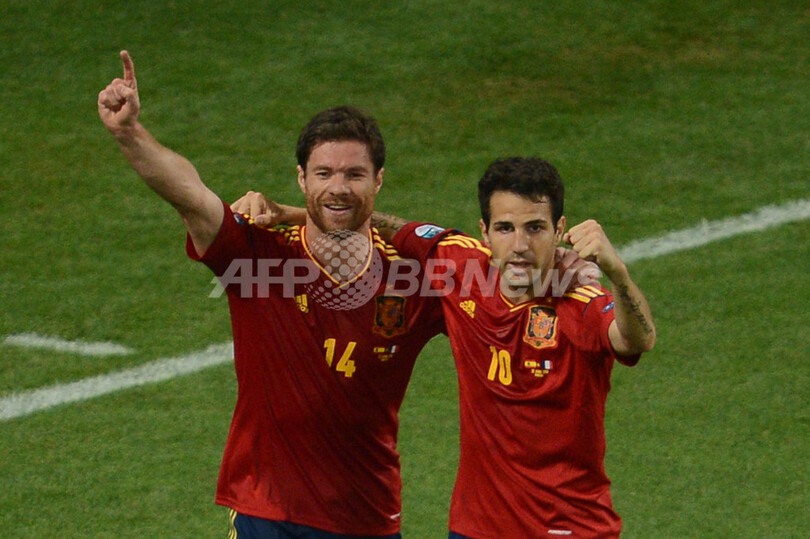 前半19分に先制点を挙げ、チームメイトのセスク・ファブレガス(Cesc Fabregas)と喜びを分かち合うスペインのシャビ・アロンソ(Xabi Alonso、左、2012年6月23日撮影)。(c)AFP/JEFF PACHOUD