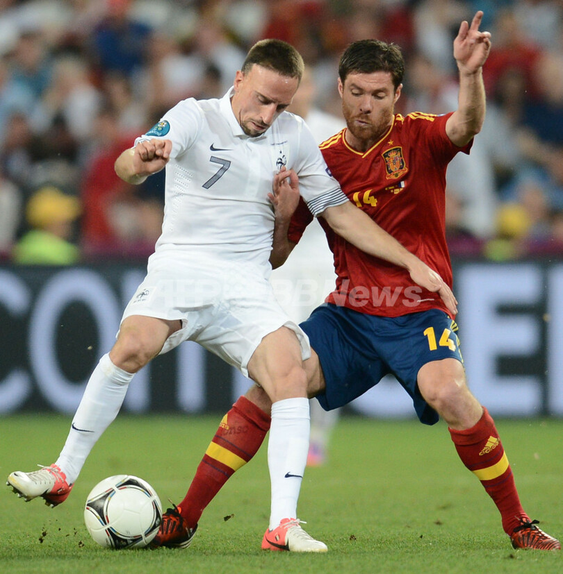 スペインのシャビ・アロンソ(Xabi Alonso)とボールを競るフランスのフランク・リベリ(Franck Ribery、2012年6月23日撮影)。(c)AFP/FRANCK FIFE