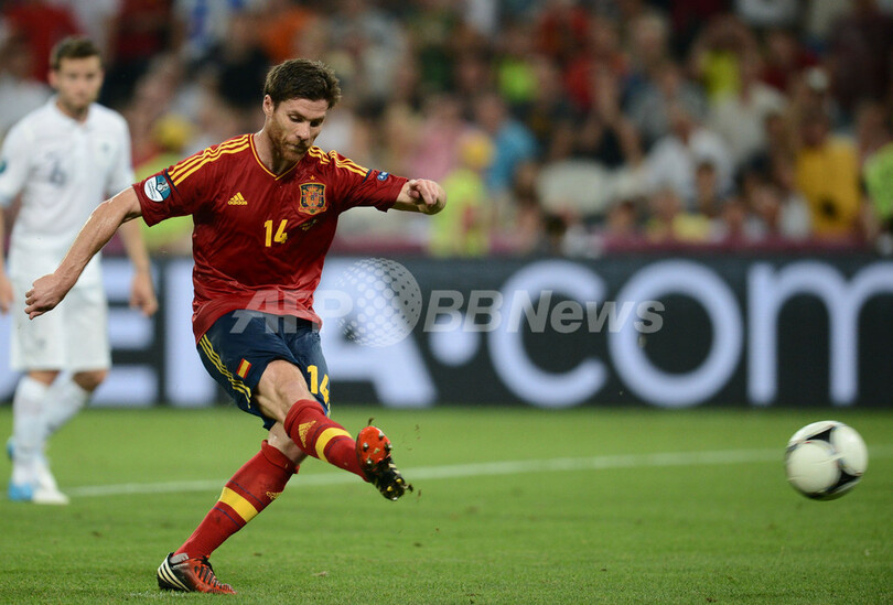 試合終了間際にPKでチーム2得点目を挙げるスペインのシャビ・アロンソ(Xabi Alonso、2012年6月23日撮影)。(c)AFP/FRANCK FIFE