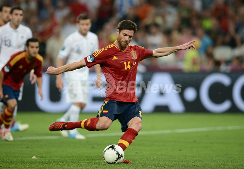 試合終了間際にPKでチーム2得点目を挙げるスペインのシャビ・アロンソ(Xabi Alonso、2012年6月23日撮影)。(c)AFP/FRANCK FIFE