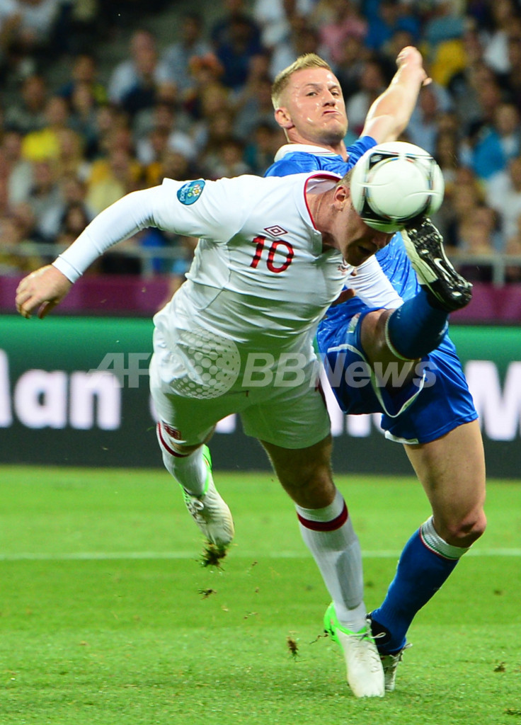 イタリアのイニャツィオ・アバーテ(Ignazio Abate、右)と競りながらシュートを打つイングランドのウェイン・ルーニー(Wayne Rooney、2012年6月24日撮影)。(c)AFP/GIUSEPPE CACACE