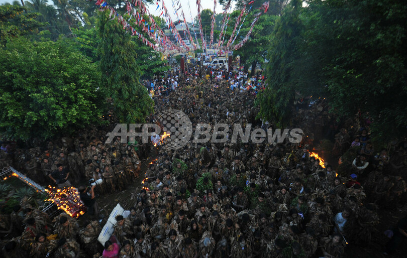 儀式が始まるのは明け方。敬けんな信者たちは水田で自らを泥とバナナの葉で身を包み、聖書に「物乞い」のような姿として描かれている洗礼者ヨハネの姿を模倣する。(c)AFP