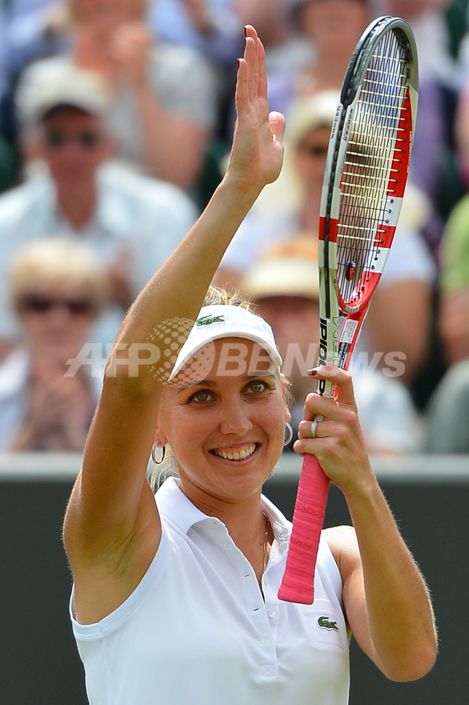 試合に勝利し、歓声に応えるエレナ・ベスニナ(2012年6月25日撮影)。(c)AFP/MIGUEL MEDINA