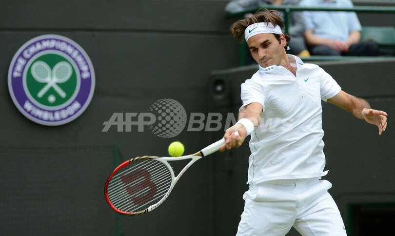 リターンを打つロジャー・フェデラー(2012年6月25日撮影)。(c)AFP/ANDREW YATES