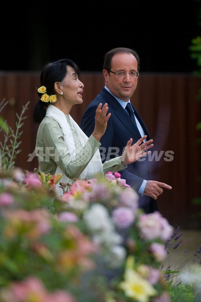 【6月27日 AFP】フランスのフランソワ・オランド(Francois Hollande)大統領は26日、パリ(Paris)のエリゼ宮(Elysee Palace)で欧州歴訪中のミャンマー最大野党・国民民主連盟(NLD)のアウン・サン・スー・チー(Aung San Suu Kyi)氏(67)と会談し、フランスはミャンマーの民主化移行を支援するために可能なあらゆる措置を取ると述べた。