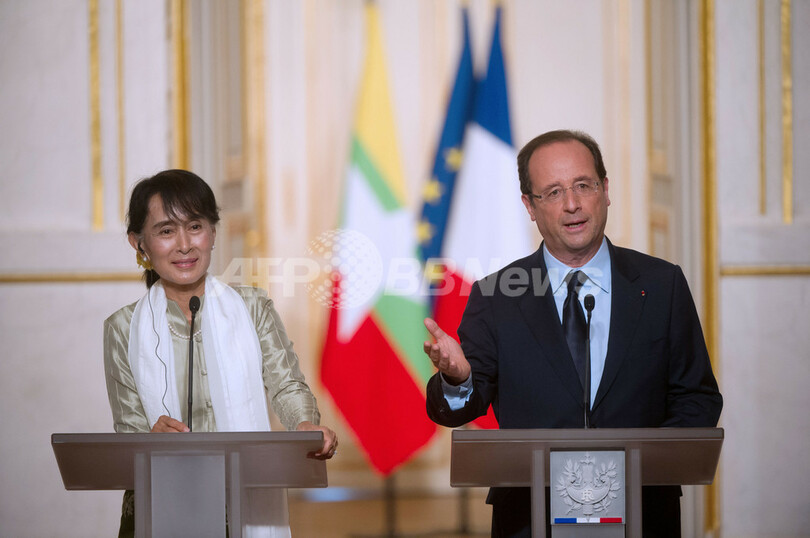 【6月27日 AFP】フランスのフランソワ・オランド(Francois Hollande)大統領は26日、パリ(Paris)のエリゼ宮(Elysee Palace)で欧州歴訪中のミャンマー最大野党・国民民主連盟(NLD)のアウン・サン・スー・チー(Aung San Suu Kyi)氏(67)と会談し、フランスはミャンマーの民主化移行を支援するために可能なあらゆる措置を取ると述べた。
