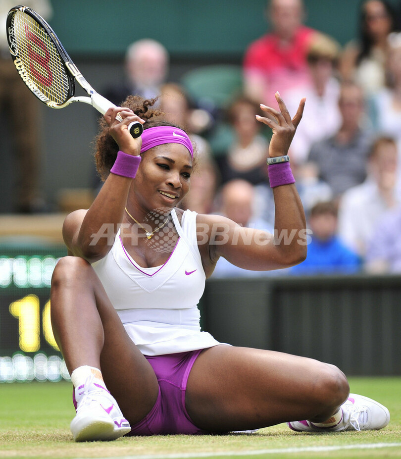 試合中に足を滑らせ転倒するセレーナ・ウィリアムス(2012年6月30日撮影)。(c)AFP/GLYN KIRK