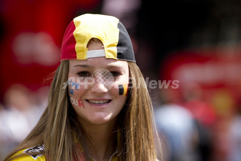 顔にペイントを施して観戦する女性ファン(2012年6月30日撮影)。(c)AFP/JOEL SAGET