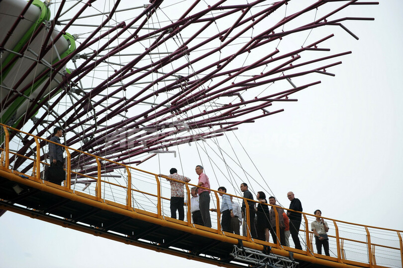 写真は正式オープンに訪問し、スーパーツリー間をつなぐスカイウオークを歩くシンガポールのリー・シェンロン(Lee Hsien Loong)首相(左から2人目、2012年6月28日撮影)。(c)AFP/ROSLAN RAHMAN