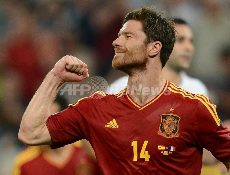 準々決勝、スペイン対フランス。得点を挙げて歓喜するスペインのシャビ・アロンソ(Xabi Alonso、2012年6月23日撮影)。(c)AFP/FRANCK FIFE