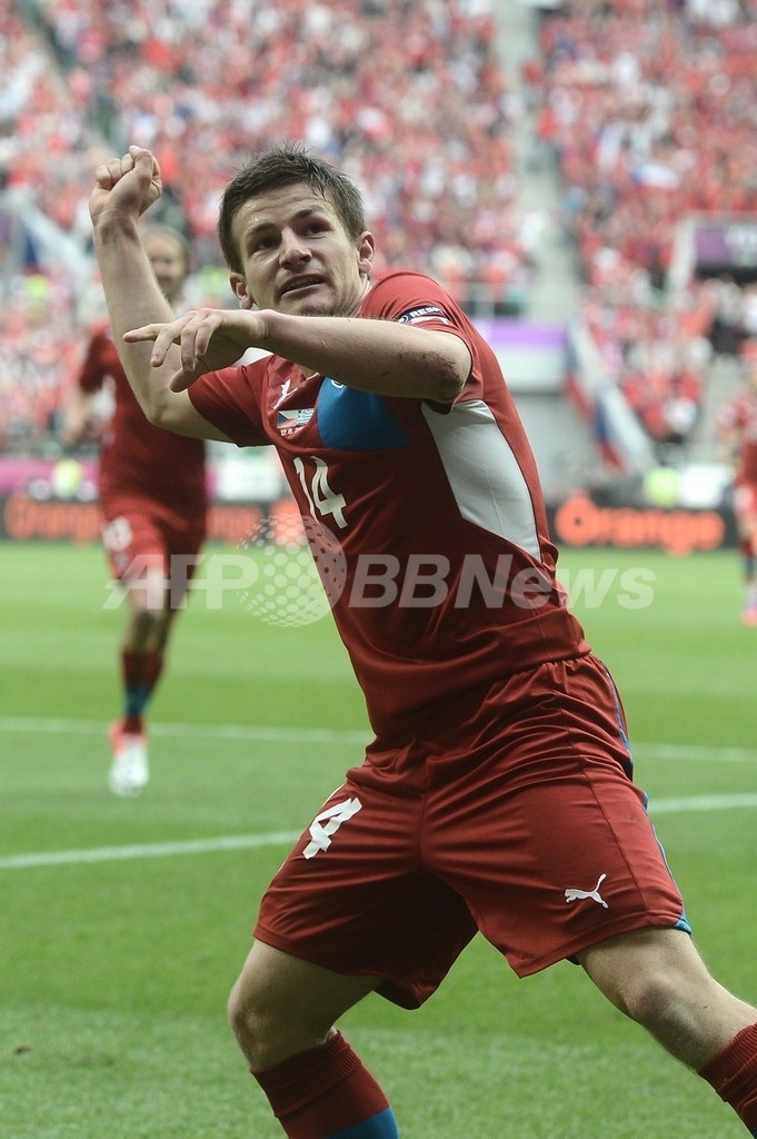 グループA、ギリシャ対チェコ。前半6分にチーム2得点目を挙げるチェコのバーツラフ・ピラージュ(Vaclav Pilar、2012年6月12日撮影)。(c)AFP/ARIS MESSINIS