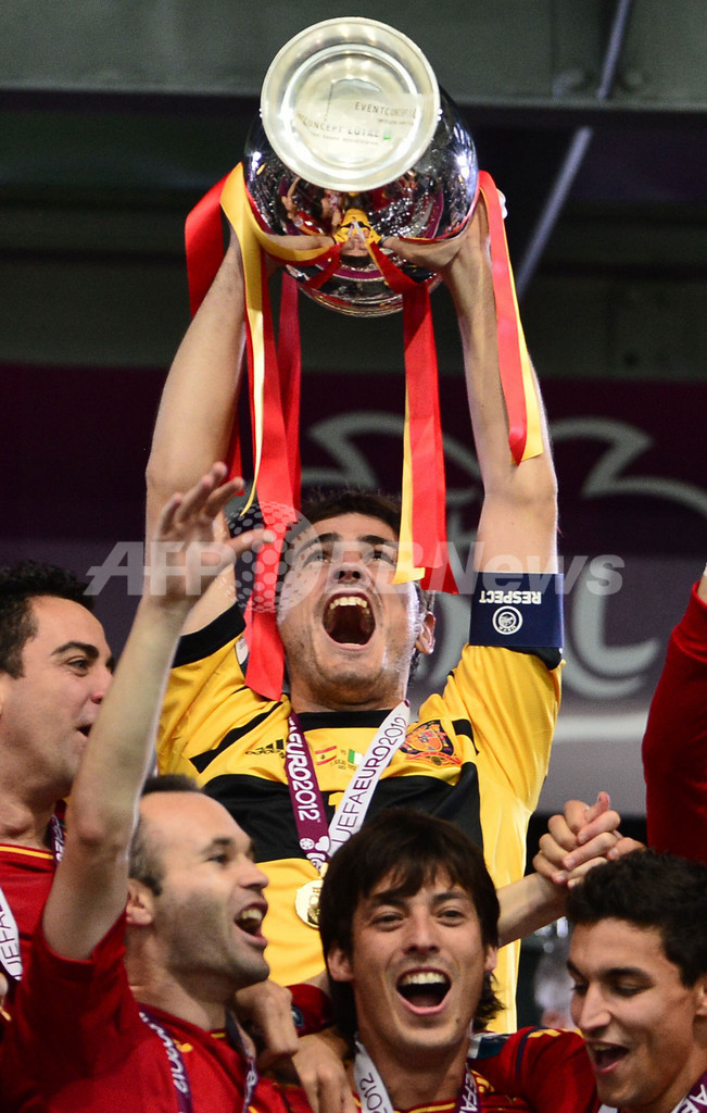 【7月2日 AFP】サッカー欧州選手権2012(UEFA Euro 2012)は1日、共催国ウクライナのキエフ(Kiev)で決勝が行われ、前回王者のスペインが4-0でイタリアを退け、欧州選手権で大会初の連覇を達成するとともに、2010年サッカーW杯(2010 World Cup)と合わせて史上初の主要国際大会3連続優勝の快挙を成し遂げた。(c)AFP