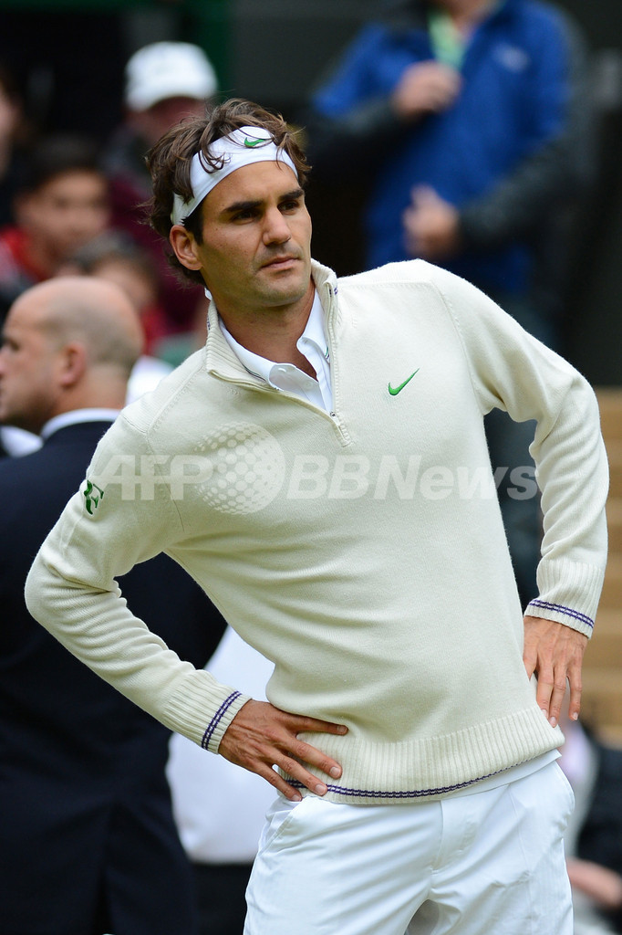 試合中断中に体を動かすロジャー・フェデラー(2012年7月2日撮影)。(c)AFP/ANDREW YATES