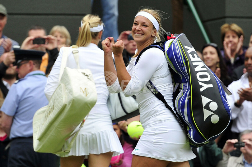 笑顔を見せながらコートを後にするザビーネ・リシキ(右、2012年7月2日撮影)。(c)AFP/GLYN KIRK