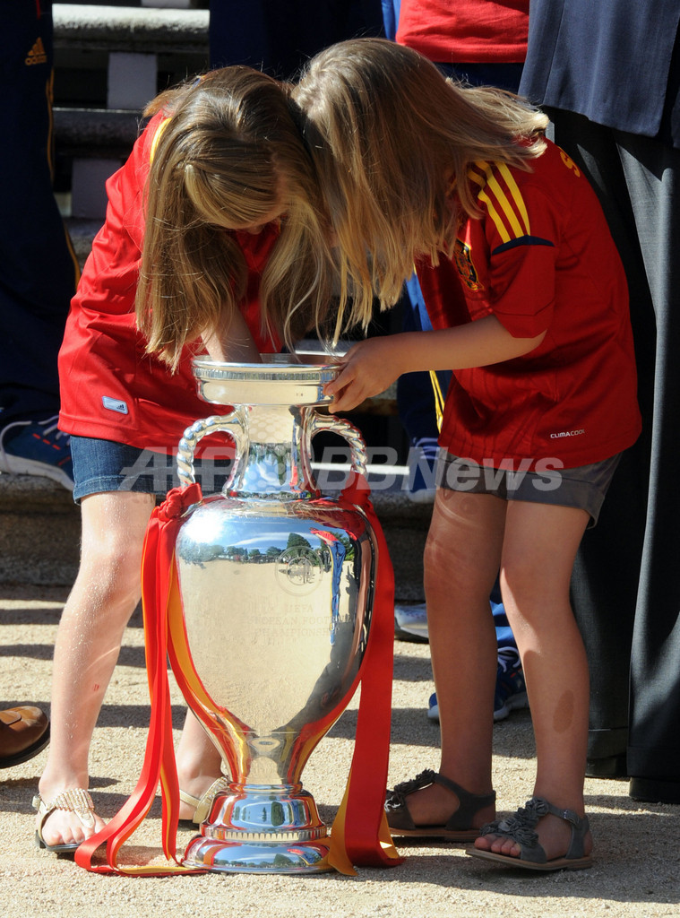 優勝トロフィーを覗き込む皇太子長女レオノール王女(Princess Leonor、左)と皇太子次女ソフィア王女(Princess Sofia、2012年7月2日撮影)。(c)AFP/POOL/DOMINIQUE FAGET
