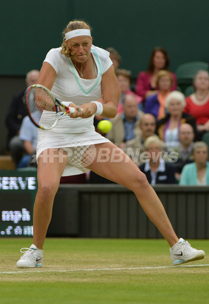 リターンを打つペトラ・クヴィトバ(2012年7月3日撮影)。(c)AFP/MIGUEL MEDINA