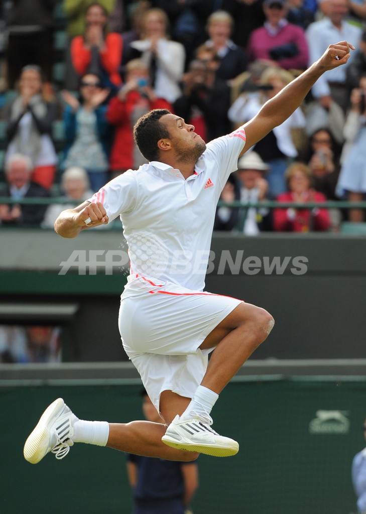 試合に勝利し歓喜するジョーウィルフリード・ツォンガ(2012年7月4日撮影)。(c)AFP/ANDREW YATES