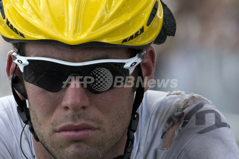 落車に巻き込まれた後、レースを走るスカイ(Sky Pro Cycling)のマーク・カヴェンディッシュ(Mark Cavendish、2012年7月4日撮影)。(c)AFP/JOEL SAGET