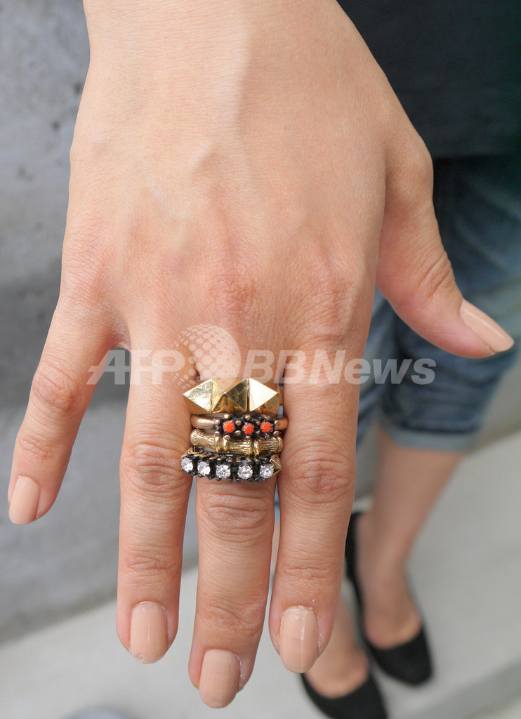アッシュ・ペー・フランス(H.P. FRANCE)の相澤枝里子(Eriko Aizawa)さんは、「リベット アンド ブルー(Rivet & Blue)」のボーイフレンドデニムにインパクトのあるトップスや小物でワザの効いたスタイル。コーデのポイントについて「あえてトレンドではなく、エイティーズのグラムっぽさをイメージしました。デニムは、膝下までたくし上げて履くのが好きです」と相澤さん。手元や耳元を彩るのは、コスチュームジュエリーが人気のブランド「イオッセリアーニ(IOSSELLIANI)」。ピアスは左右でストーンの色が違う。バングルは6本、リングは4本セットなのでまとめて着けたり1本ずつ着けたりといろいろな楽しみ方ができる。