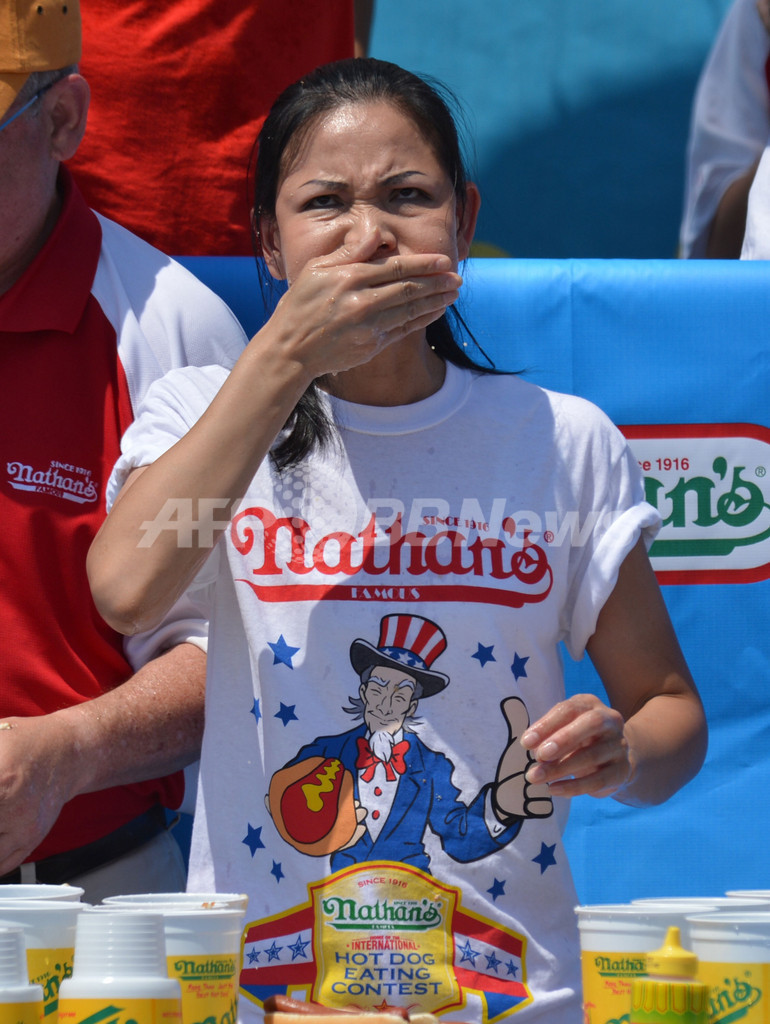 【7月5日 AFP】米独立記念日の4日、ニューヨーク(New York)州コニーアイランド(Coney Island)で毎年恒例のホットドッグ早食い大会が行われた。女性の部では10分間に45個を完食したソーニャ・トーマス(Sonya Thomas)さん(44)が優勝し、観客の盛大な歓声を浴びた。