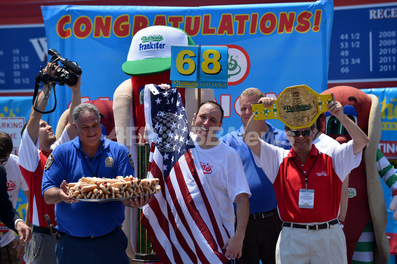 男性の部では、「ジョーズ(Jaws、顎)」ことジョーイ・チェスナット(Joey Chestnut)さん(28)が2009年に自らが打ち立てた記録に並ぶ68個を完食し、他の14人の出場者を圧倒する強さで6連覇を果たした。