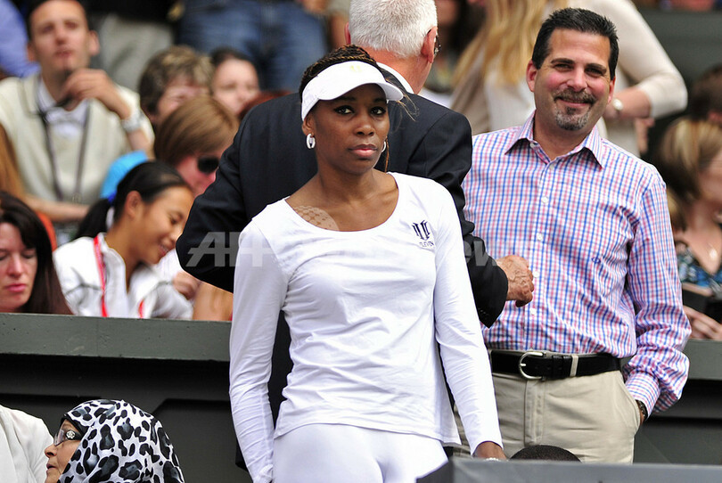 試合を観戦するセレーナ・ウィリアムスの姉ヴィーナス・ウィリアムス(Venus Williams、2012年7月5日撮影)。(c)AFP/GLYN KIRK